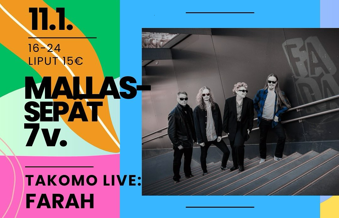 Mallassepät Lietsalantie 11, Naantali, FinlandTammikuussa juhlitaan kun Mallassepät täyttää 7 vuotta, ja Taproom Takomo yhden! Päivän aikataulu Ovet avataan / 12:00 Happy hour / 12:00-16:00 Lyhennetty panimokierros 45min (15€) / 16:00 Olutvisa ja muuta ohjelmaa / 18:00 Lyhennetty panimokierros 45min (15€) / 19:00 Takomo Live / FARAH / 20:00 & 22:00 ”Farah on nelihenkinen bändi Turusta, jonka musiikki on…
