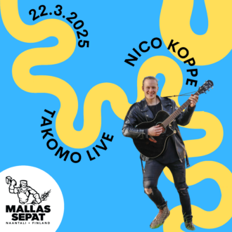 Mallassepät Lietsalantie 11, Naantali, FinlandTakomo Live / Nico Koppe Nico soittaa tunnettuja Pop/Rock covereita, vuosikymmenten varrelta. Mukaan saattaa muutama omakin kappale lipsahtaa.Luvassa iloista, rentoa ja energistä meininkiä! Keikat klo 20:00 & 22:00 Tapahtumaan on ilmainen sisäänpääsy!