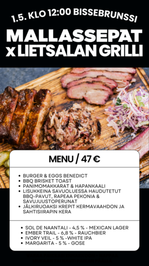 Mallassepät Lietsalantie 11, Naantali, FinlandTule 1.5. panimolle nauttimaan Bissebrunssista! - Marko loihti upean menun, johon paritimme bisset. Varaa paikkasi ennakkoon (shop@mallassepat.fi) ja tule nauttimaan paikan päälle tai nappaa herkut mukaan! - HUOM! Paikan päällä nautittuna oluiden annoskoko 20 cl, mukaan otettuna 33 cl. - Brunssi tarjolla klo 12:00-15:00Hinta 47€ sisältäen ruoat ja juomat. - MENU:- BURGER & EGGS BENEDICT-…