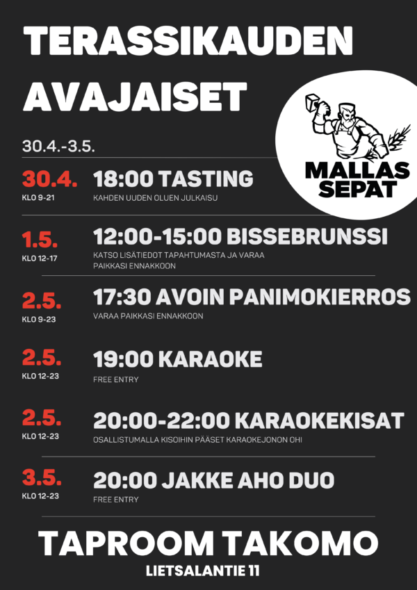 Mallassepät Lietsalantie 11, Naantali, FinlandOhjelmassa: 30.4. klo 18:00: Kahden uuden oluen julkaisu ja tasting. 1.5. klo 12:00 - 15:00 Bissebrunssi 2.5. klo 17:30 Panimokierros klo 19:00 Karaoke klo 20:00 - 22:00 Karaokekisat 3.5. klo 20:00 TAKOMO LIVE: Jakke Aho